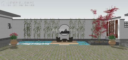 主通道線腳和屋檐細節相對充足,起到引人注重的功效,木色大門和局部鏤空的深灰色網格相得益彰,雙側設置竹池,寓意節節升;