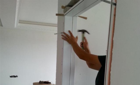咱們從徒弟的裝載流程中能夠看見,徒弟先是在確認門套的尺寸后,在地面把門套給組裝好。接著再投到門洞里,以及一圈用木片給卡好,以做暫時固定。固然這類裝載方法和其余徒弟并沒有什么差別,門套也全是如此裝載的。但是徒弟接下來的解決,就十分特別了。從下圖中能夠看見,徒弟還在門套雙方根據等距離的方法,固定了幾個小鐵片。