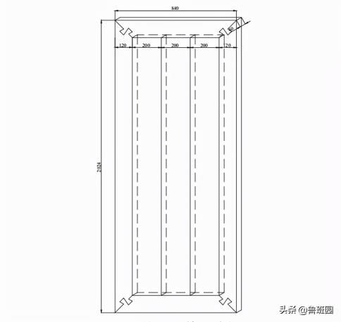 左右冒挺的尺寸為外側長度2 024 mm、內側長度1784 mm,寬度120mm,高低冒頭的外側長度840mm、內側長度600mm、寬度120mm,厚度均為40mm。左冒挺與上冒頭接合縫的角度為45°,如下圖所示,4個角均采取該接合方法。